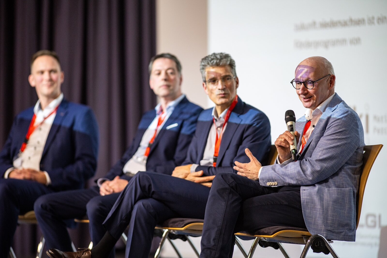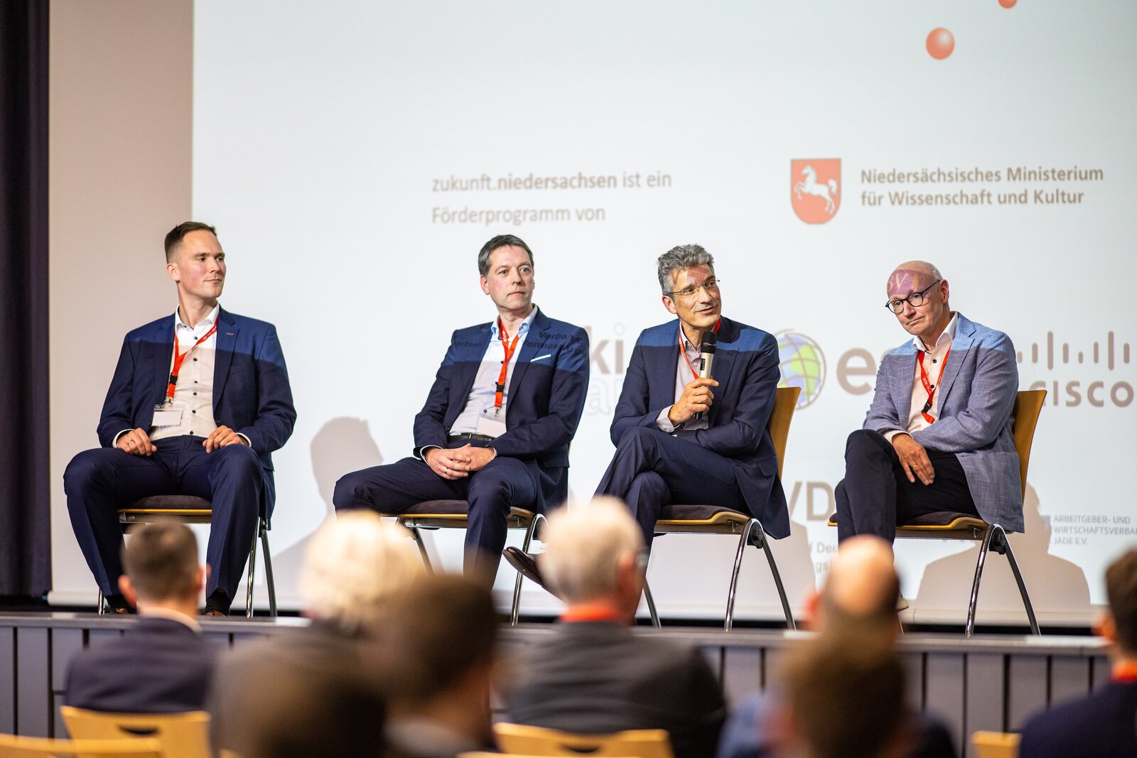 Nach einem Impulsvortrag von Prof. Dr. Antonio Krüger, CEO des Deutschen Forschungszentrums für Künstliche Intelligenz zu den aktuellen Entwicklungen von KI, leitete Dr. John Goodyear, Moderator für die Podiumsdiskussion, in den inhaltlichen Teil der Veranstaltung über. Zusammen mit Prof. Dr. Hero Weber (Vizepräsident Studium, Lehre, Weiterbildung der Jade Hochschule), Prof. Dr. Sascha Koch (Teilprojektleiter Spatial AI, Jade Hochschule), Prof. Dr. Christian Denker (Teilprojektleiter AI for Navigation, Jade Hochschule) und Prof. Dr. Antonio Krüger sprach er über die Umsetzungsmöglichkeiten von KI an der Jade Hochschule und über die zentralen gesellschaftlichen Herausforderungen, die mit KI gelöst werden können.