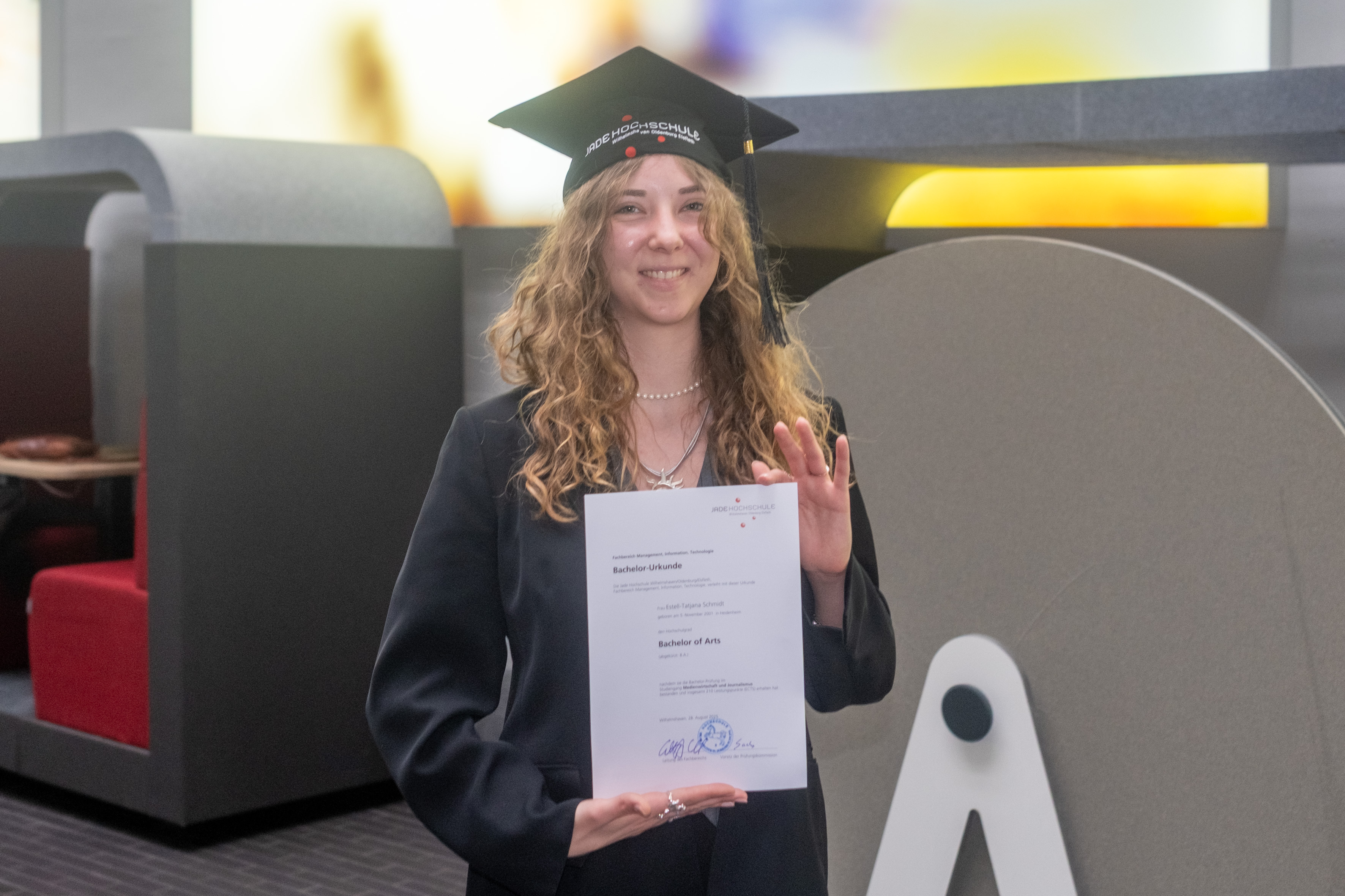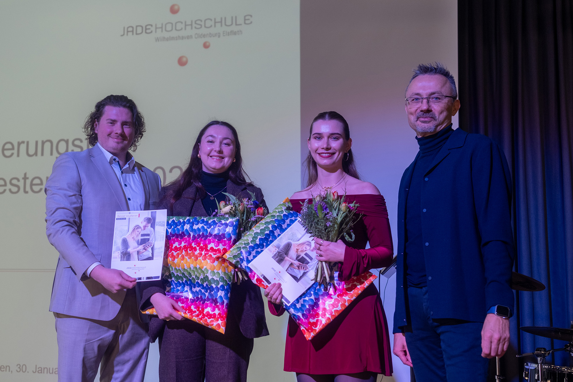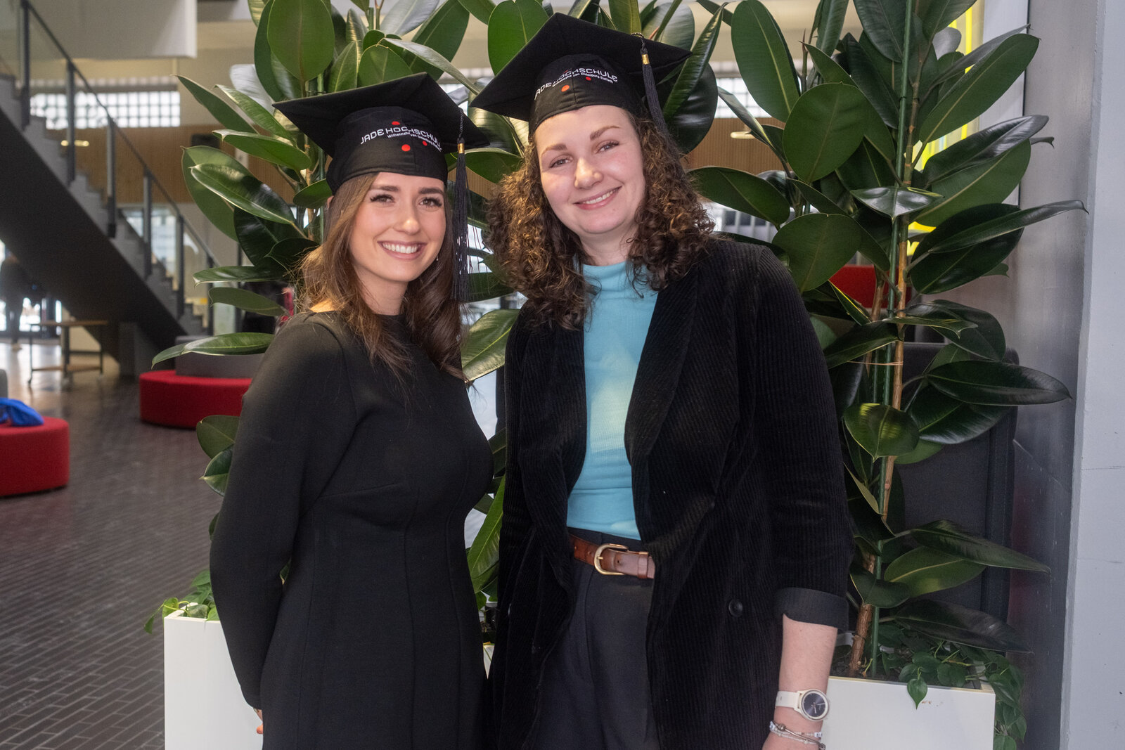 Am Studienort Wilhelmshaven wurden insgesamt 301 Studierende graduiert. Markus Bulla, Vorsitzender des Vereins zur Förderung der Jade Hochschule in Wilhelmshaven e.V., zeichnete 18 Absolvent_innen aus, die in ihren jeweiligen Studiengängen den besten Notendurchschnitt erzielt haben. Letje Malle und Lea Prawit – Absolventinnen des Studiengangs Medienwirtshaft und Journalismus am Fachbereich Management, Information, Technologie – nahmen den diesjährigen Sozialpreis entgegen. Sie erhalten die Auszeichnung für ihr herausragendes Engagement für die Belange der Studierenden an der Jade Hochschule am Studienort in Wilhelmshaven.