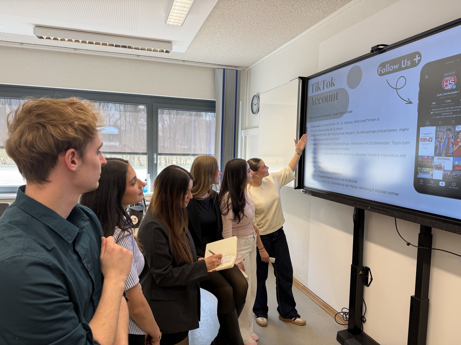 Im Rahmen einer Projektarbeit haben Schülerinnen und Schüler der 12. Klasse der Berufsbildenden Schulen (BBS) Wechloy im Schwerpunkt Wirtschaft ein vollständiges, professionelles Konzept für den Messeauftritt der Jade Hochschule auf der Job4U Messe in Oldenburg erarbeitet.