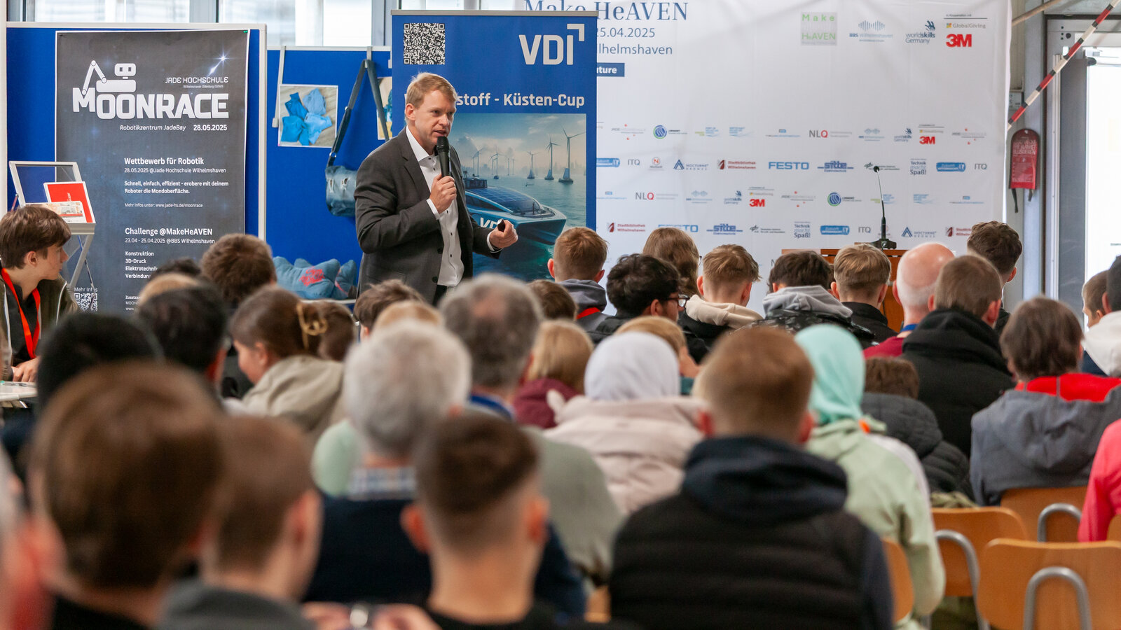 Auch die Jade Hochschule war mit spannenden Formaten vertreten. So konnten Schüler_innen mit Prof. Dr. André Mastmeyer Drohnenschwärme mit Python selbst programmieren, mit Andreas Baumgart in die Welt von Lego Serious Play eintauchen oder einen Vortrag zur Wasserstoffwertschöpfungskette von Prof. Dr. Karsten Oehlert besuchen. Gegeneinander antreten konnten die Schüler_innen in einer Robotik-Challenge des „Robotikzentrum JadeBay“ unter Anleitung von Tim Sirek und Jan Dierks. Mit dem Ziel einer Prototyp-Demonstration am Ende der dreitägigen Veranstaltung war nicht nur technisches Geschick, sondern auch Teamarbeit und Projektmanagement gefragt.